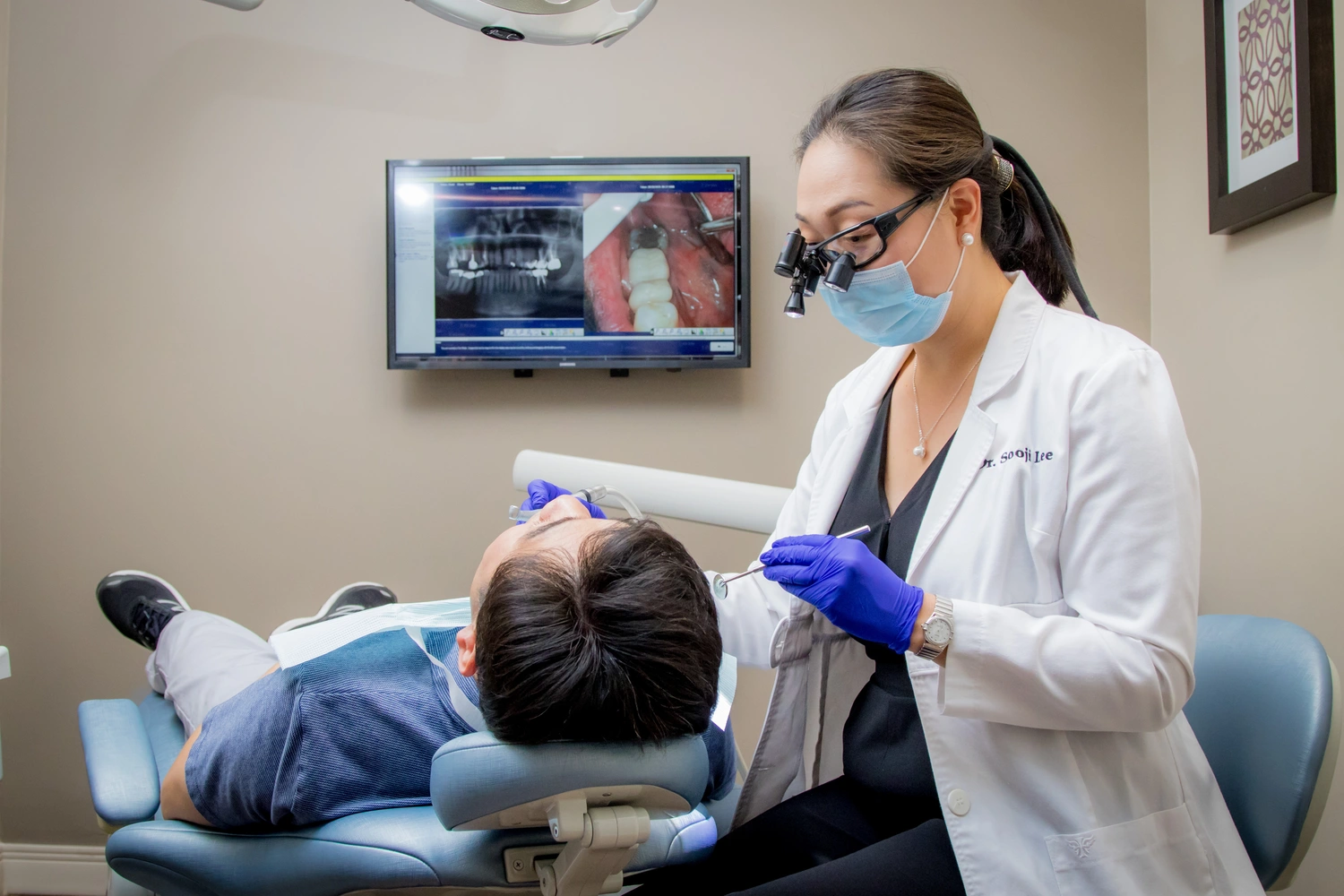 A dentist examines a patient lying in a dental chair